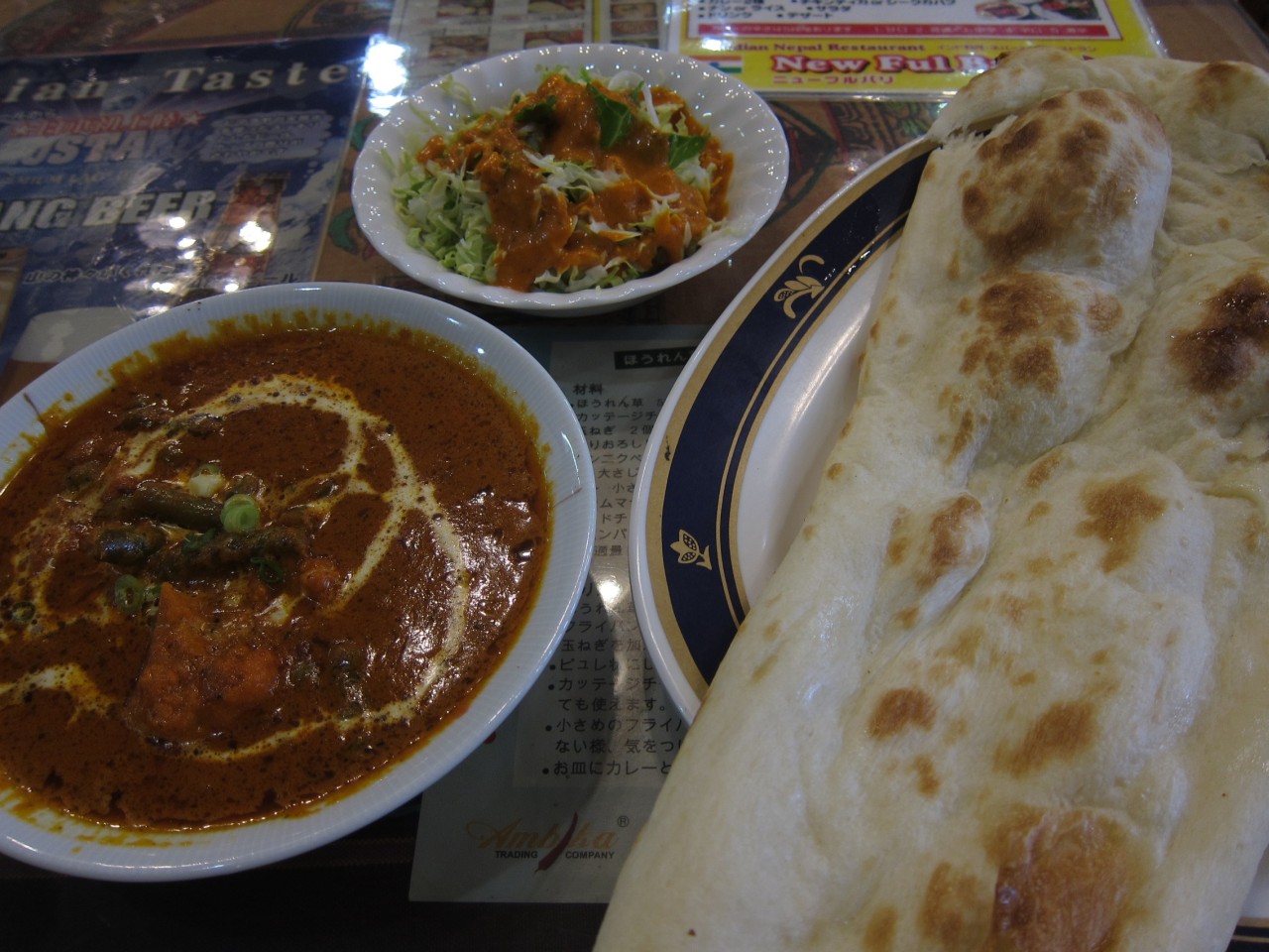 ランチタイムはキーマやチキンなど、いくつかのカレーでメニューが構成されている。今回はベジタブルカレーをチョイス。ナン・サラダ・ドリンクが付いて 830 円。辛さは 1~5 の 5 段階で選べるので、4(辛口)にした。出てきてびっくりしたのは、ナンの大きさ。全長 40cm くらいあると思う。とてもデカイ。